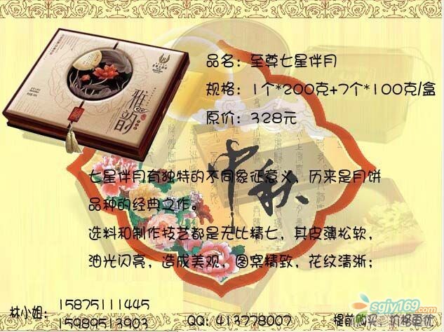 正文摘要:本帖最后由 Rachel 于 2014-9-4 09:17 編輯 萊斯七星伴月,月餅中的勞斯萊斯 五星品質(zhì),五星享受,是您送禮的最佳選擇! 最后23盒,售完即止,員工價(jià)優(yōu)惠全城,快快來電吧! |